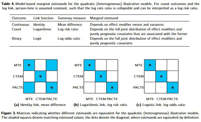 My presentation was largely based on the assessment of clinical efficacy/effectiveness, and my co-presenters delved more deeply into implications for economic evaluation using decision analytical modeling and cost-effectiveness analysis. I defined and clarified the interpretation of different marginal and conditional average treatment effects. I later outlined potential estimand mismatches under different hypothetical outcome-generating mechanisms, with and without effect modification. While these mismatches have primarily been recognized for non-collapsible summary measures, they are also problematic for some collapsible measures in the presence of effect modification. Finally, I discussed implications for transportability and evidence synthesis. I have co-authored a paper with David covering these topics.